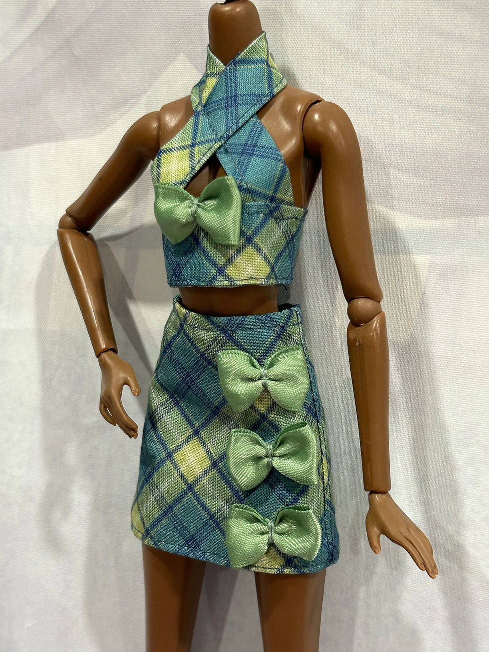 This listing is for a custom black and pink pvc dress with pink stitched details and pink bows. White ruffled trim decorates the bust. Made to fit a G1/G2 MH Doll. Snap closures at the back. Includes black stockings.